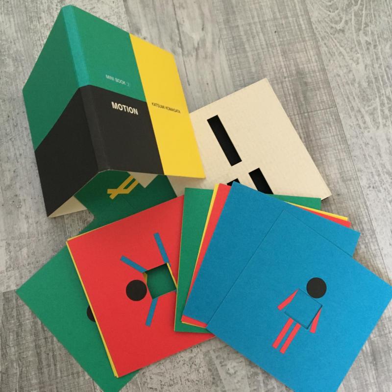 Livres – fiches : des mini livres qui ne sont en fait que de fiches rangées dans un coffret : « Motion » nous propose des petits personnages stylisés avec des trous : l’enfant peut construire une histoire avec les fiches, deviner ce que la suivante représente ou créer son cours de gymnastque en mimant les personnages.