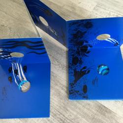 Des livres qui s’agrandissent et se déplient : « bleu » nous permet de suivre un petit poisson qui s’engouffre dans des trous : l’histoire se déroule au fur et à mesure que le petit carré se déplie en tous sens, proposant à terme, une grande page sur laquelle l’on peut retracer toute l’aventure du petit poisson… et la revivre en la repliant.