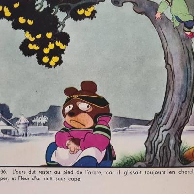 L'ours dut rester au pied de l'arbre, car il glissait toujours en chechant à y grimper, et Fleur d'or riait sous cape.